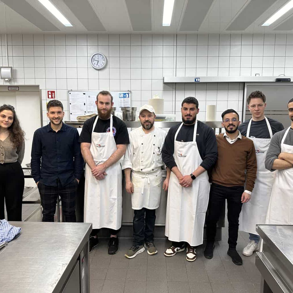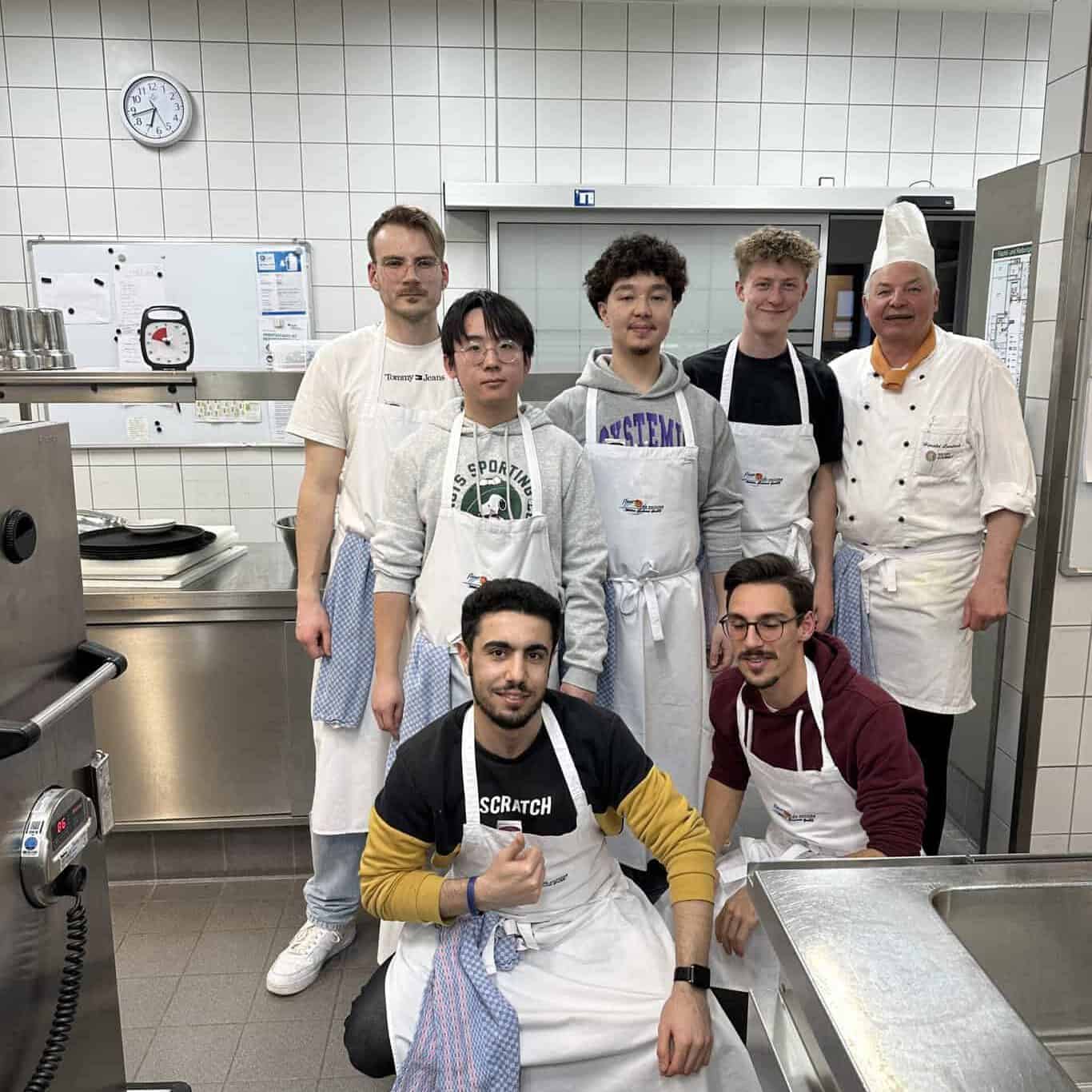 Begleitet vom Küchenchef der Wilken Gourmet GmbH, Herrn Laatsch und seinem Team, kochen die Studierenden gemeinsam ein wohlschmeckendes 3 Gänge Menü in ansprechender Atmosphäre. Auch wenn die ein oder andere Teilnehmer*in zu Beginn etwas skeptisch ist, entsteht ein Menü aus biologischen Lebensmitteln der gehobenen Küche und ist es während dem Prozess auch noch so chaotisch, wird immer um 19:00 Uhr der ersten Gang serviert.